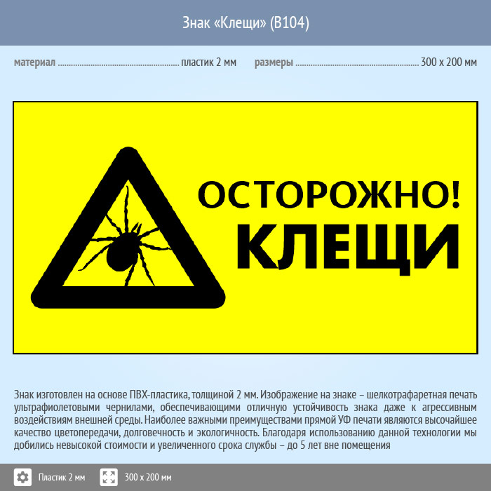 Знак «Осторожно! Клещи», B104 (пластик, 400х300 мм) в Томске купить