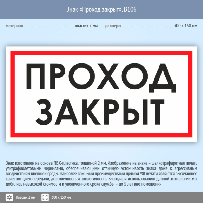 Знак «Проход закрыт», B106 (пластик, 300х150 мм) в Томске купить