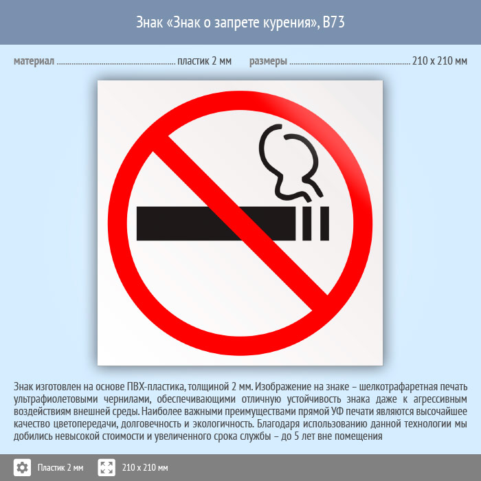 Знак «Знак о запрете курения», B73 (пластик, 210х210 мм) в Томске купить