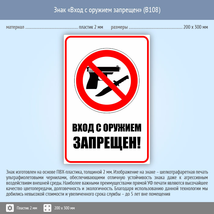 Знак «Вход с оружием запрещен», B108 (пластик, 200х300 мм) в Томске купить