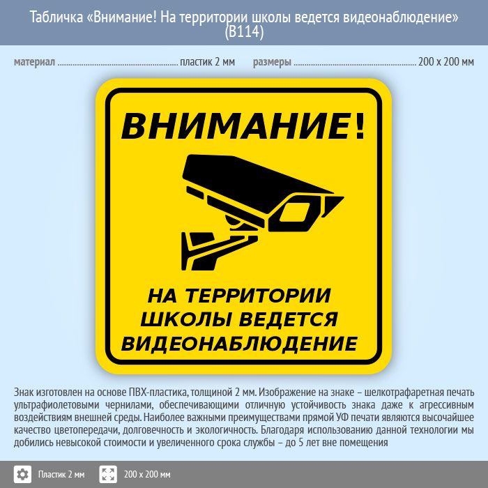 Табличка «Внимание! На территории школы ведется видеонаблюдение», B114 (пластик, 200х200 мм) в Томске купить