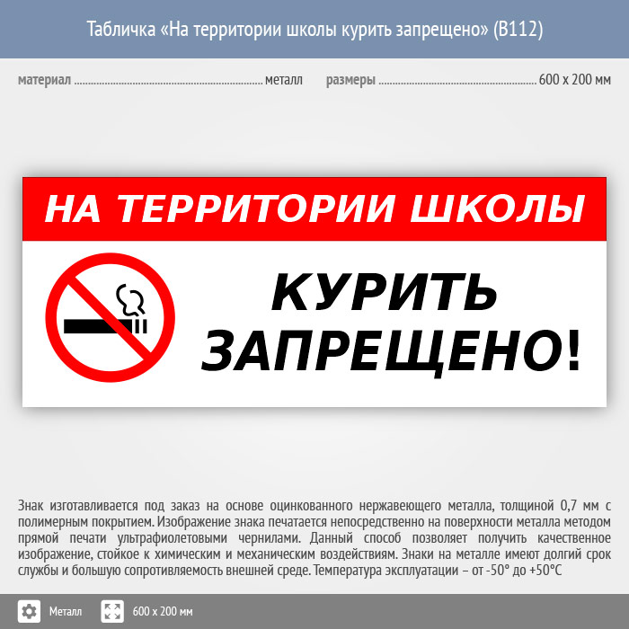 Табличка «На территории школы курить запрещено», B112 (металл, 600х200 мм) в Томске купить