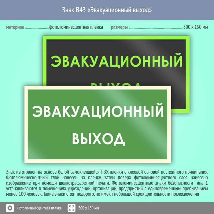 Знак B43 «Эвакуационный выход» (фотолюминесцентная пленка, 300х150 мм) в Томске купить