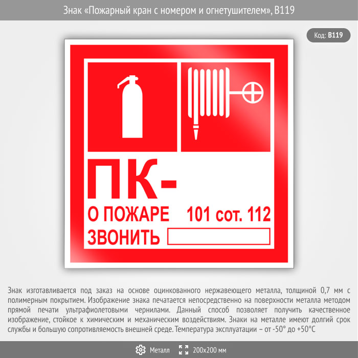 Знак «Пожарный кран с номером и огнетушителем», B119 (металл, 200х200 мм) в Томске купить