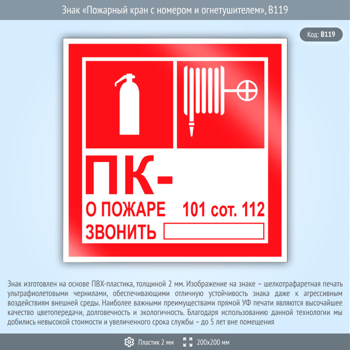 Знак «Пожарный кран с номером и огнетушителем», B119 (пластик, 200х200 мм) в Томске купить