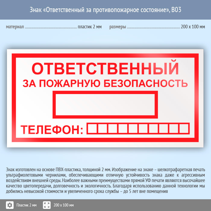 Знак «Ответственный за пожарную безопасность», B03 (пластик, 200х100 мм) в Томске купить