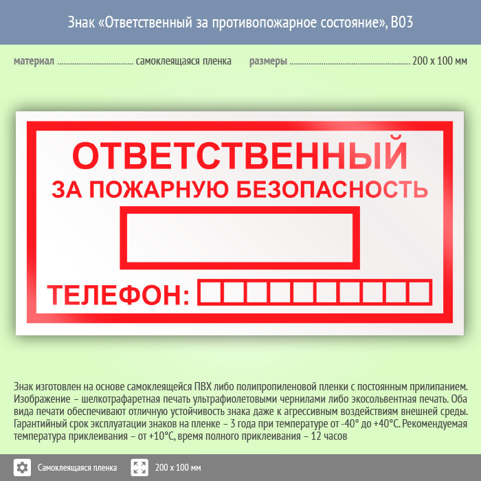 Знак «Ответственный за пожарную безопасность», B03 (пленка, 200х100 мм) в Томске купить