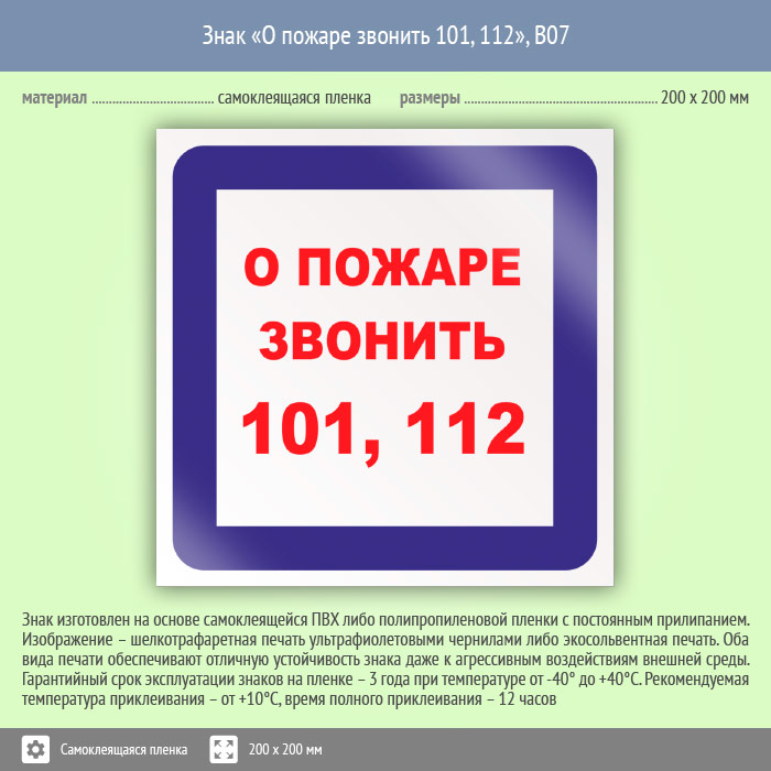 Знак «О пожаре звонить 101, 112», B07 (пленка, 200х200 мм) в Томске купить