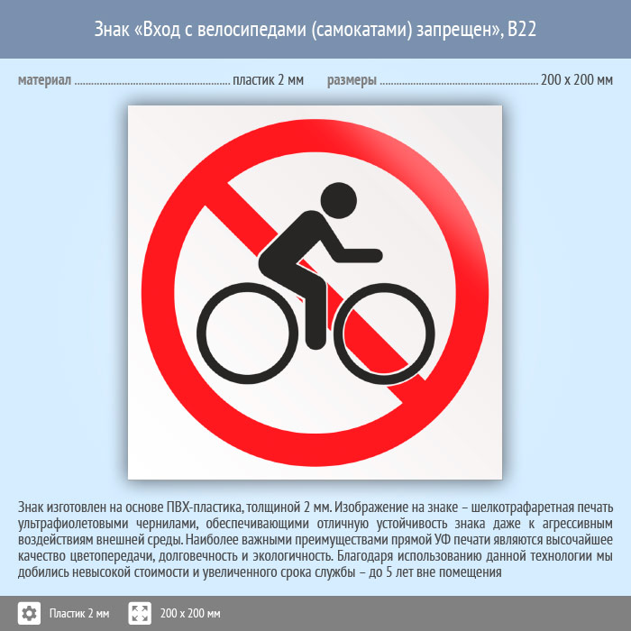 Знак «Вход с велосипедами (самокатами) запрещен», B22 (пластик, 200х200 мм) в Томске купить