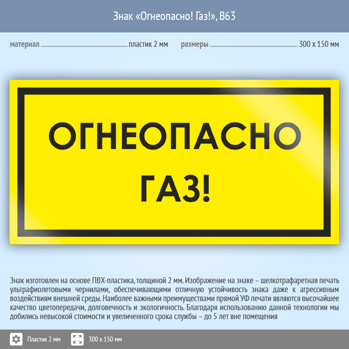 Знак «Огнеопасно! Газ!», B63 (пластик, 300х150 мм) в Томске купить
