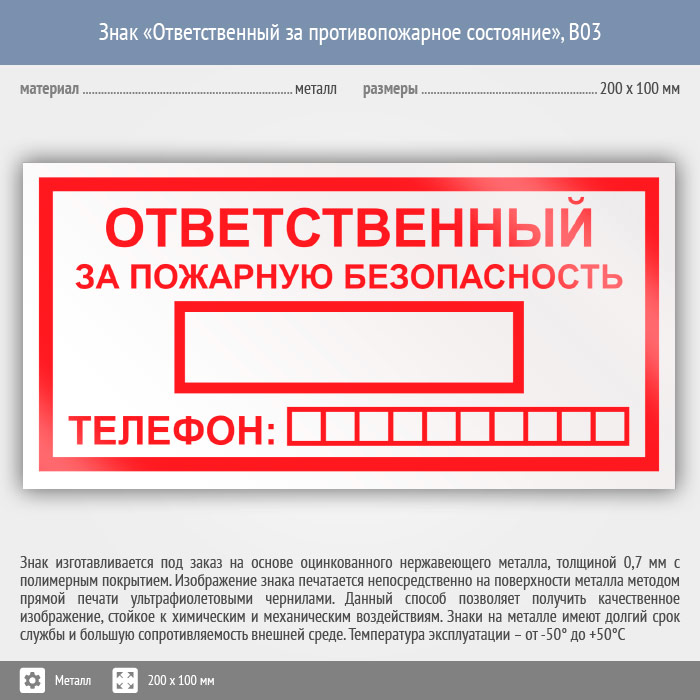 Знак «Ответственный за пожарную безопасность», B03 (металл, 200х100 мм) в Томске купить