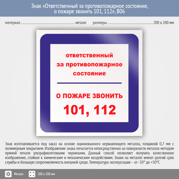 Знак «Ответственный за противопожарное состояние, о пожаре звонить 101, 112», B06 (металл, 200х200 мм) в Томске купить