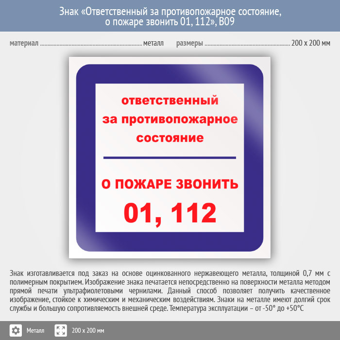Знак «Ответственный за противопожарное состояние, о пожаре звонить 01, 112», B09 (металл, 200х200 мм) в Томске купить