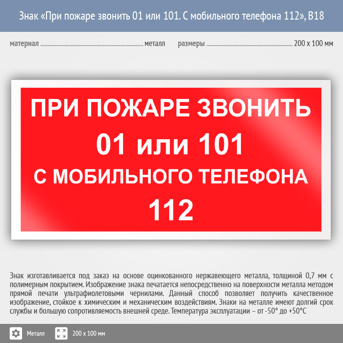 Знак «При пожаре звонить 01 или 101. С мобильного телефона 112», B18 (металл, 200х100 мм) в Томске купить
