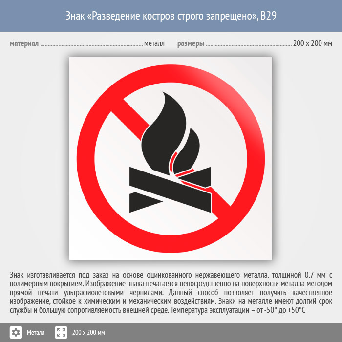 Знак «Разведение костров строго запрещено», B29 (металл, 200х200 мм) в Томске купить