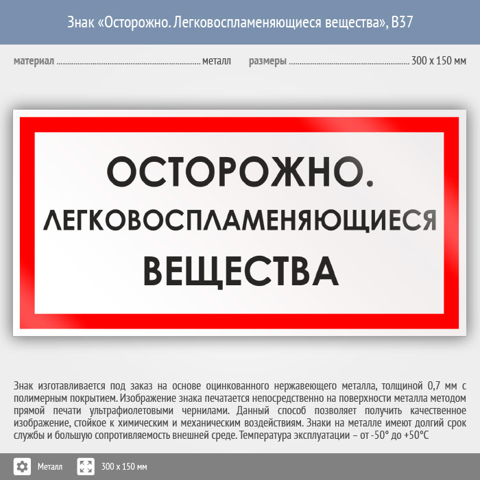 Знак «Осторожно. Легковоспламеняющиеся вещества», B37 (металл, 300х150 мм) в Томске купить