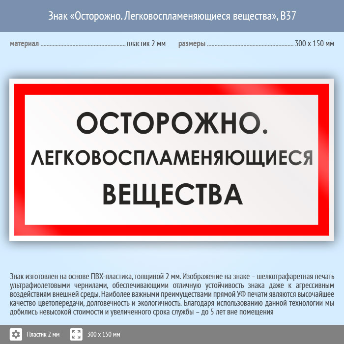 Знак «Осторожно. Легковоспламеняющиеся вещества», B37 (пластик, 300х150 мм) в Томске купить