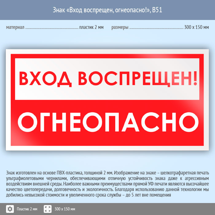 Знак «Вход воспрещен, огнеопасно!», B51 (пластик, 300х150 мм) в Томске купить