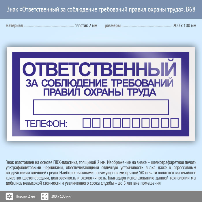 Знак «Ответственный за соблюдение требований правил охраны труда», B68 (пластик, 200х100 мм) в Томске купить