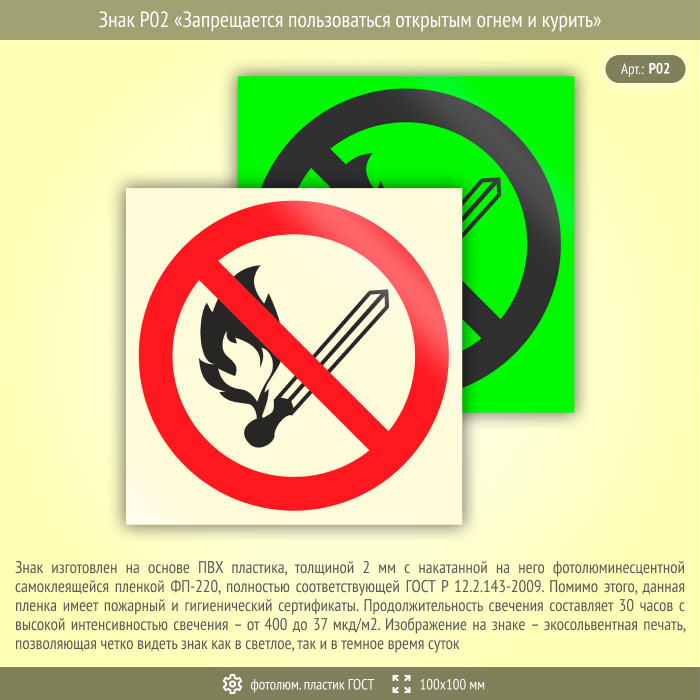 Знак P02 «Запрещается пользоваться открытым огнем и курить» (фотолюминесцентный пластик ГОСТ 34428-2018, 100х100 мм) в Томске купить