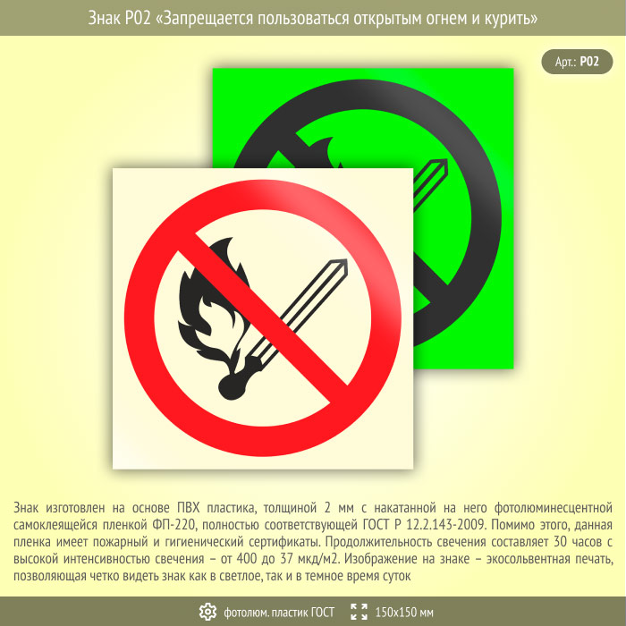 Знак P02 «Запрещается пользоваться открытым огнем и курить» (фотолюминесцентный пластик ГОСТ 34428-2018, 150х150 мм) в Томске купить