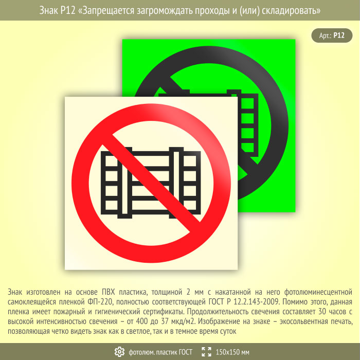 Знак P12 «Запрещается загромождать проходы и (или) складировать» (фотолюминесцентный пластик ГОСТ 34428-2018, 150х150 мм) в Томске купить