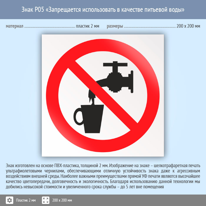 Знак P05 «Запрещается использовать в качестве питьевой воды» (пластик, 200х200 мм) в Томске купить