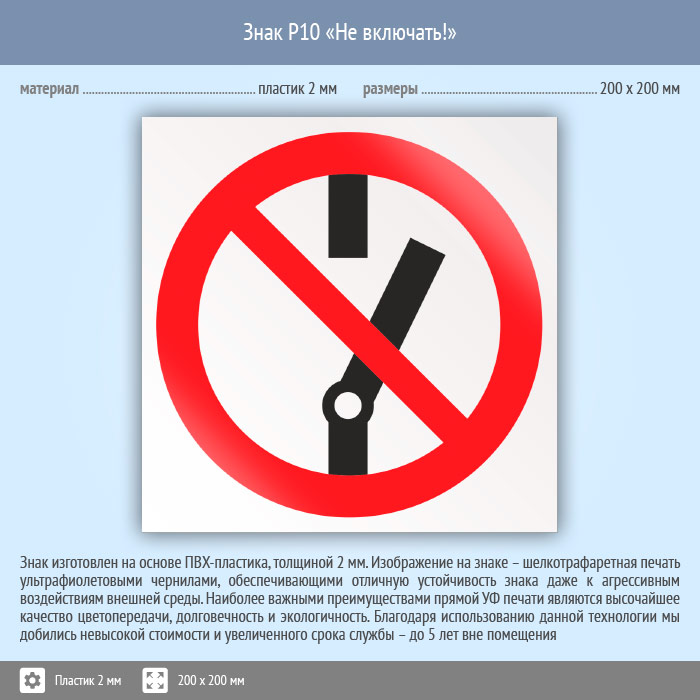 Знак P10 «Не включать!» (пластик, 200х200 мм) в Томске купить