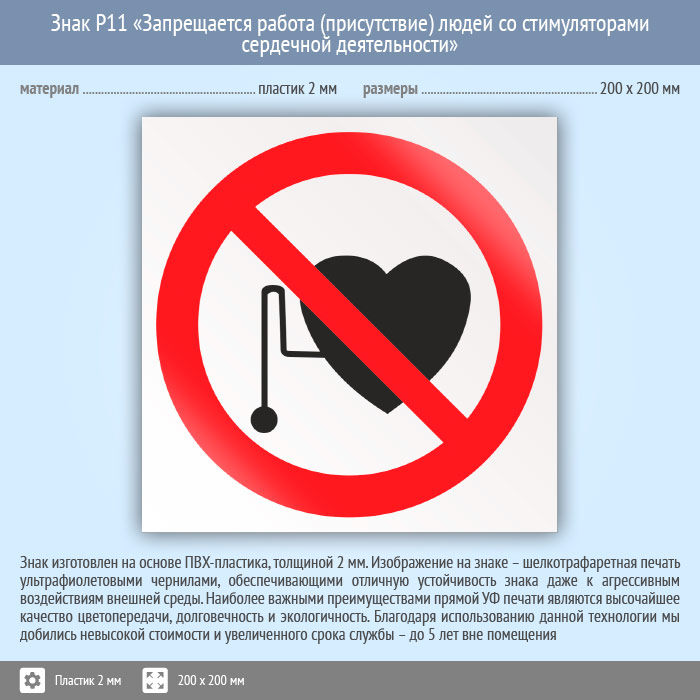 Знак P11 «Запрещается работа (присутствие) людей со стимуляторами сердечной деятельности» (пластик, 200х200 мм) в Томске купить