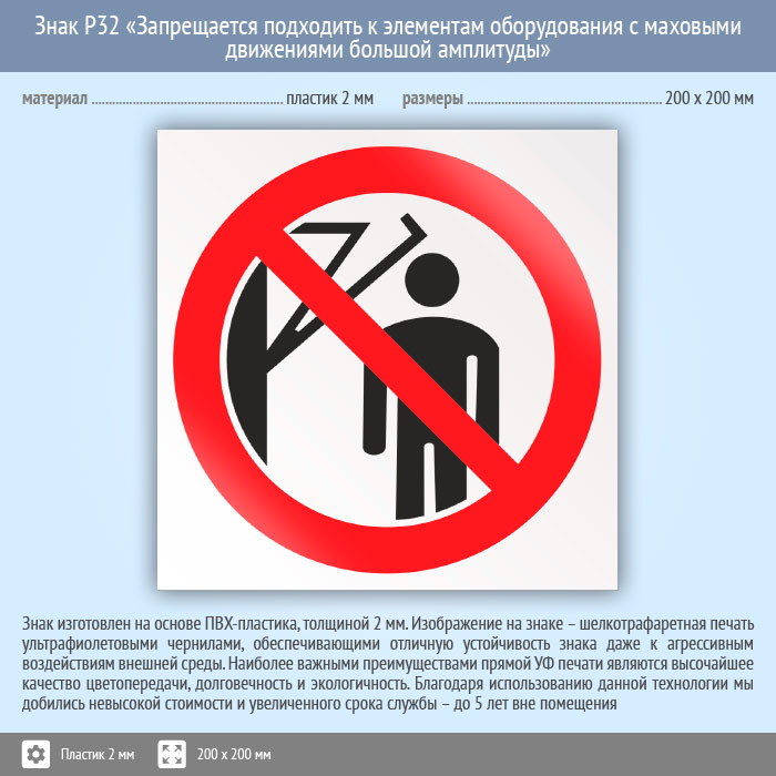 Знак P32 «Запрещается подходить к элементам оборудования с маховыми движениями большой амплитуды» (пластик, 200х200 мм) в Томске купить