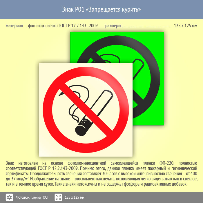 Знак P01 «Запрещается курить» (фотолюминесцентная пленка ГОСТ 34428-2018, 125х125 мм) в Томске купить
