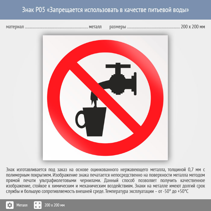 Знак P05 «Запрещается использовать в качестве питьевой воды» (металл, 200х200 мм) в Томске купить