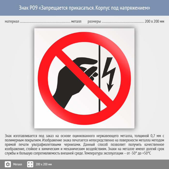 Знак P09 «Запрещается прикасаться. Корпус под напряжением» (металл, 200х200 мм) в Томске купить