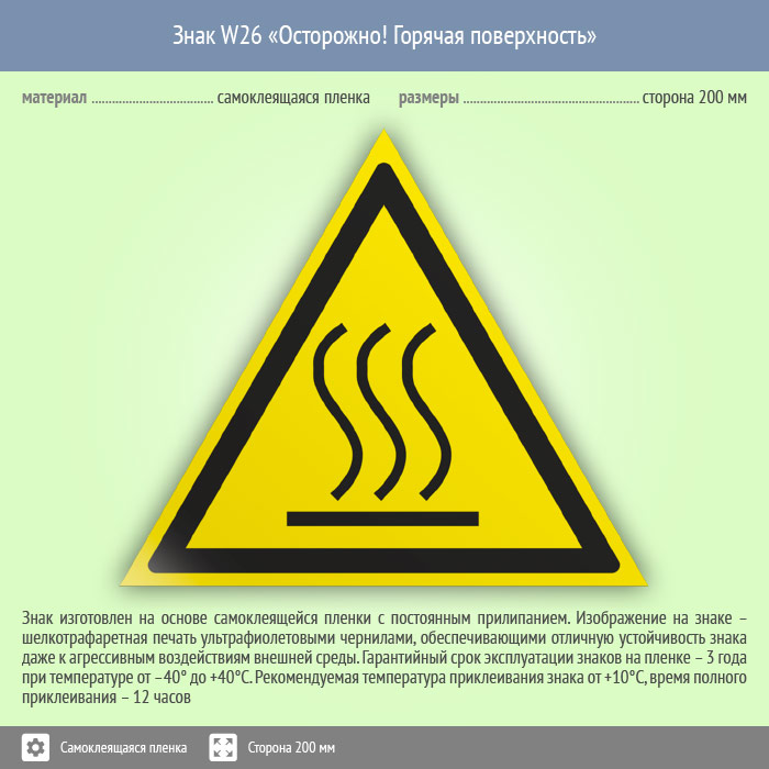 Знак «Осторожно! Горячая поверхность» предупреждает о том, что поверхность может оказаться горячей. Код знака: W26