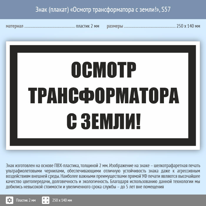 Знак (плакат) «Осмотр трансформатора с земли!», S57 (пластик, 250х140 мм) в Томске купить