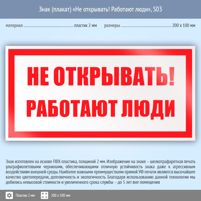 Знак (плакат) «Не открывать! Работают люди», S03 (пластик, 200х100 мм) в Томске купить