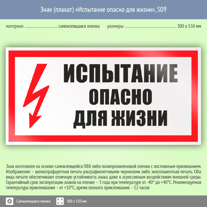 Знак (плакат) «Испытание опасно для жизни», S09 (пленка, 300х150 мм) в Томске купить