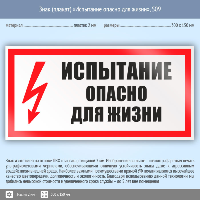 Знак (плакат) «Испытание опасно для жизни», S09 (пластик, 300х150 мм) в Томске купить