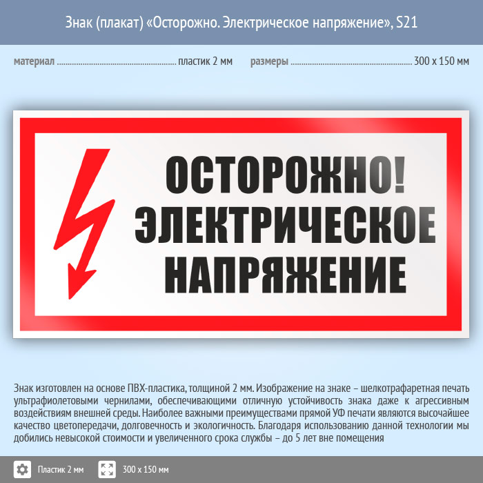 Знак (плакат) «Осторожно. Электрическое напряжение», S21 (пластик, 300х150 мм) в Томске купить
