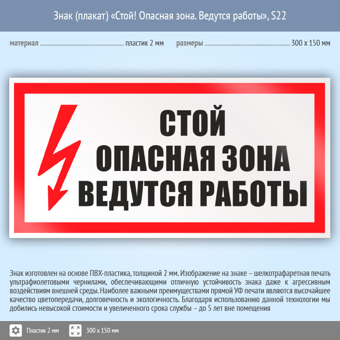 Знак (плакат) «Стой! Опасная зона. Ведутся работы», S22 (пластик, 300х150 мм) в Томске купить
