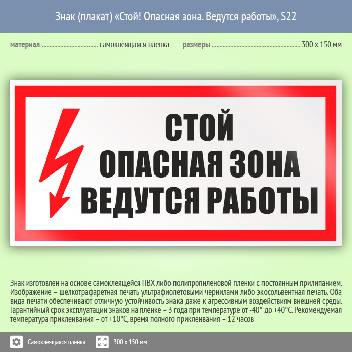 Знак (плакат) «Стой! Опасная зона. Ведутся работы», S22 (пленка, 300х150 мм) в Томске купить