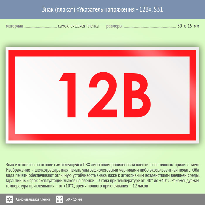 Знак (плакат) «Указатель напряжения 12 В», S31 (50 штук, пленка, 30х15 мм) в Томске купить