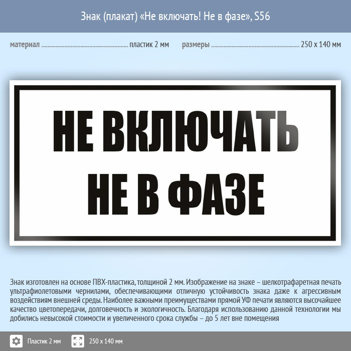 Знак (плакат) «Не включать! Не в фазе», S56 (пластик, 250х140 мм) в Томске купить