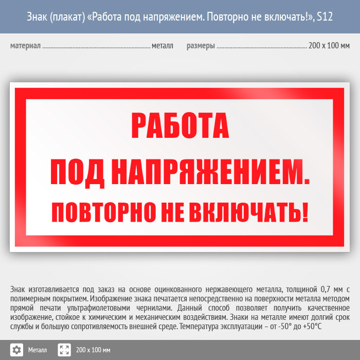 Знак (плакат) «Работа под напряжением. Повторно не включать!», S12 (металл, 200х100 мм) в Томске купить