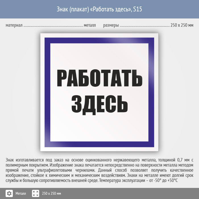 Знак (плакат) «Работать здесь», S15 (металл, 250х250 мм) в Томске купить