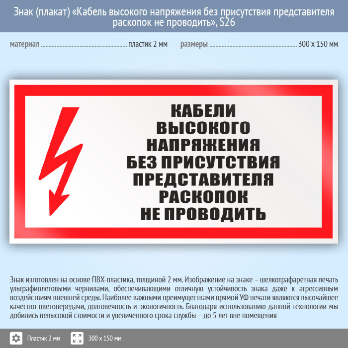 Знак (плакат) «Кабель высокого напряжения без присутствия представителя раскопок не проводить», S26 (пластик, 300х150 мм) в Томске купить