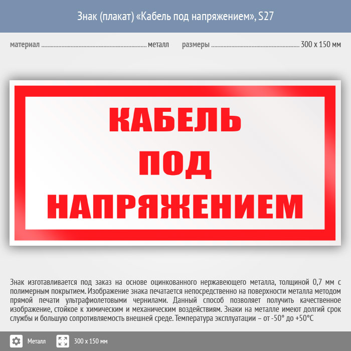 Знак (плакат) «Кабель под напряжением», S27 (металл, 300х150 мм) в Томске купить