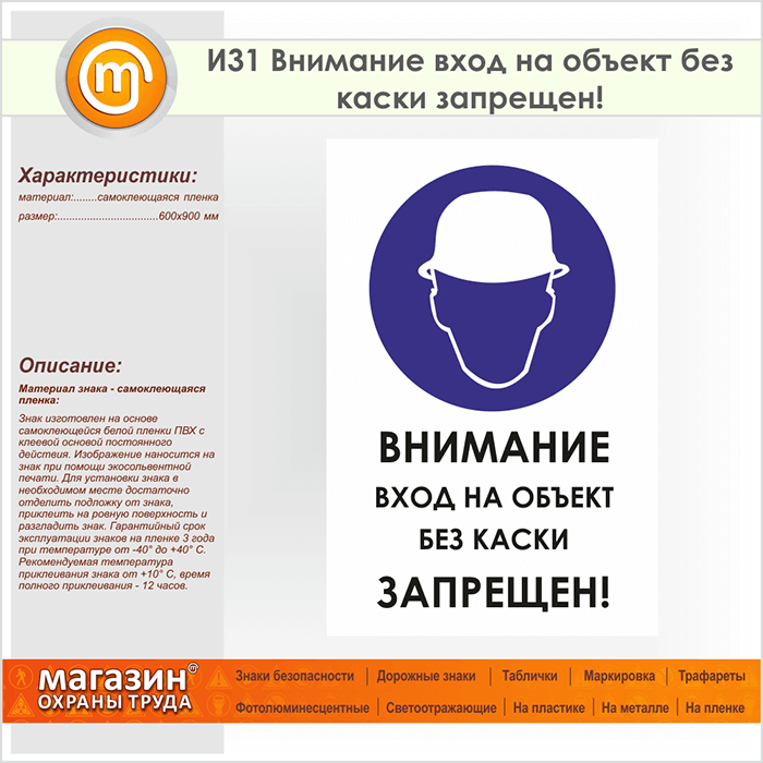 Знак «Внимание вход на объект без каски запрещен!», И31 (пленка, 600х900 мм) в Томске купить