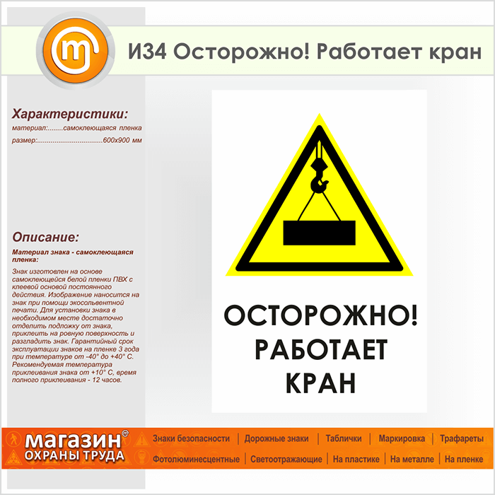 Знак «Осторожно! Работает кран», И34 (пленка, 600х900 мм) в Томске купить