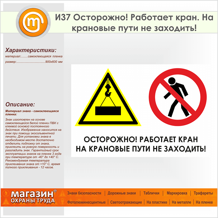 Знак «Осторожно! Работает кран. На крановые пути не заходить!», И37 (пленка, 900х600 мм) в Томске купить